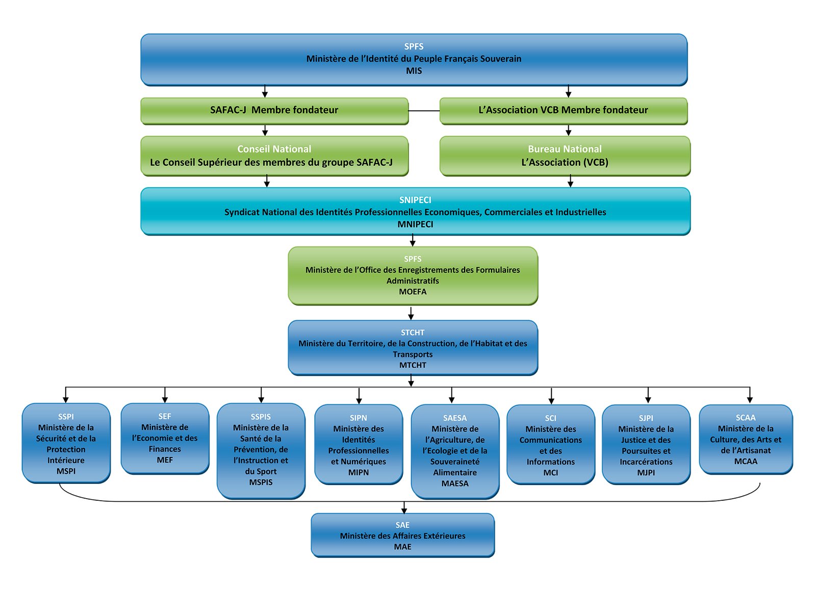 Le Syndicat Anti-Fraude, Anti-Corruption-Justice du groupe SAFAC-J, chargé de la mise en place et d’administrer la réorganisation du pays et s’occuper de la dissolution et réquisition des structures mises en place dans l’illégalité sur le territoire Français et des Dom Tom.